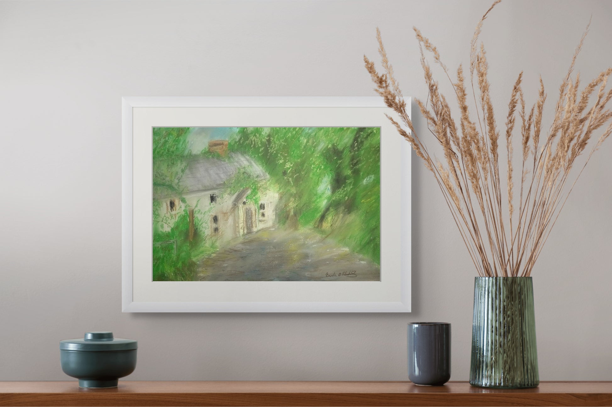 This A3 pastel drawing is framed in a white wooden, glazed frame for protection.