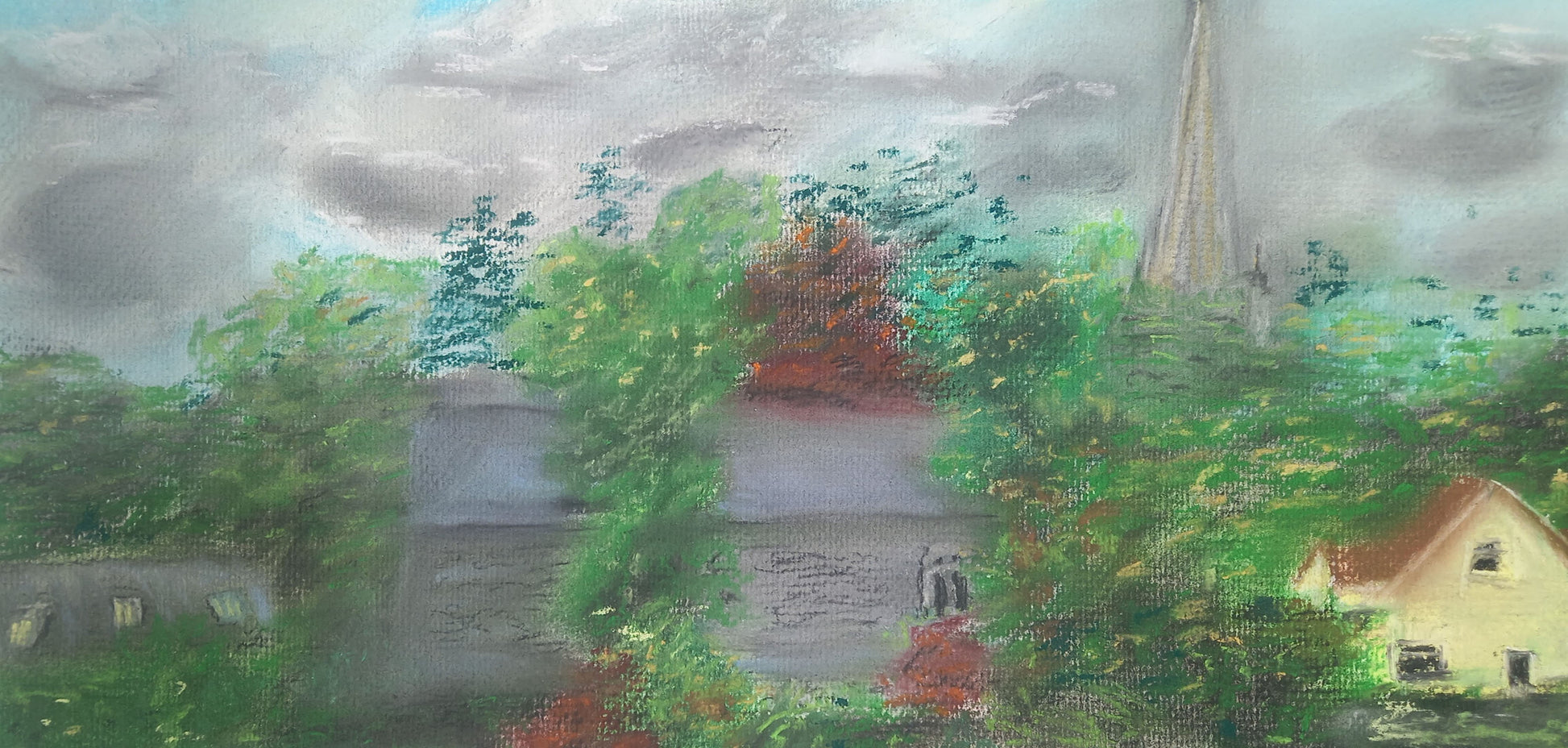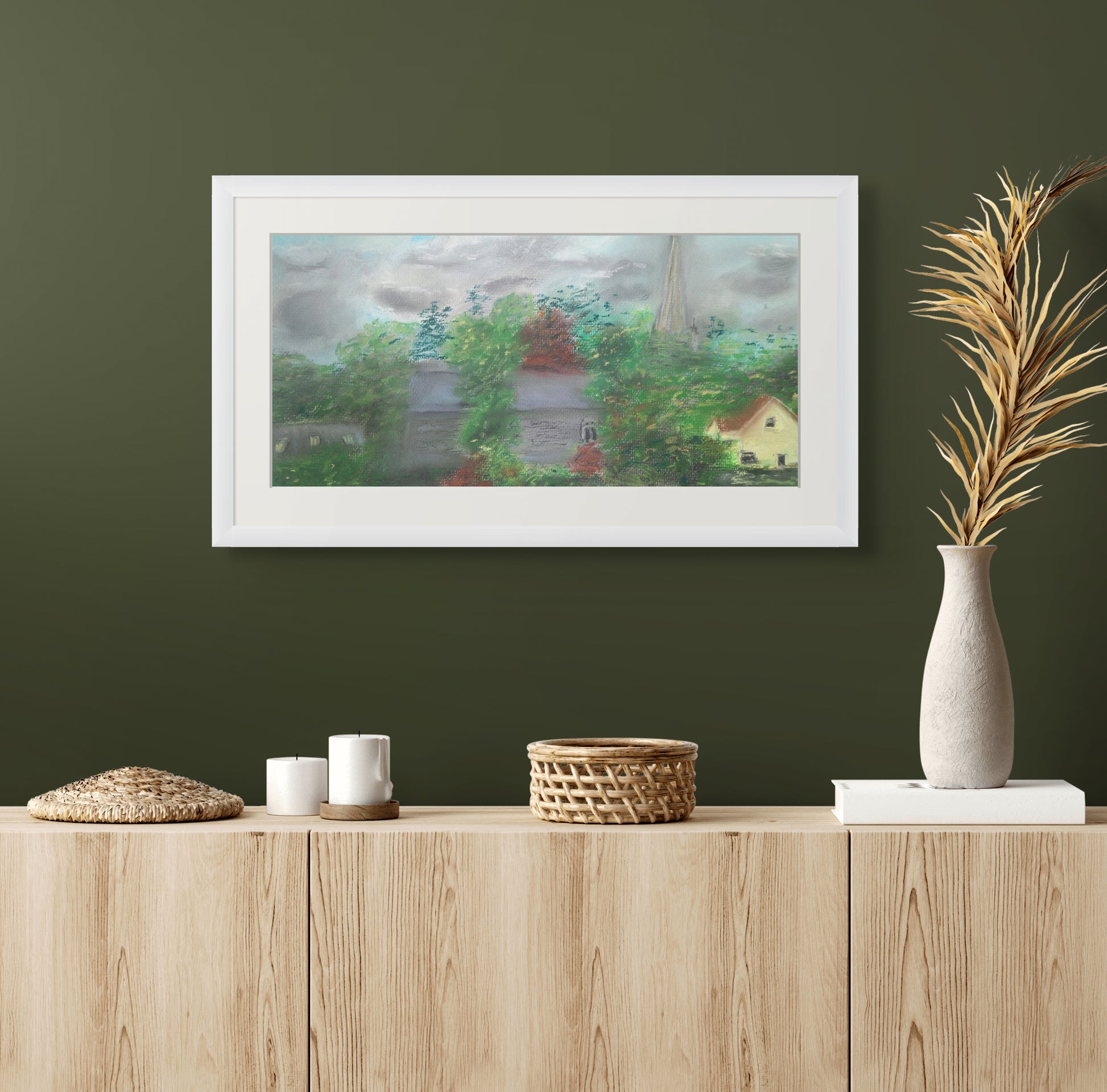 Sitting in my studio, looking out of the window I felt inspired to pint the view. the roof tops and the The Virginia Church is a landamark of our town, with it's macacured park and graveyard. Will be going to the framers soon.
